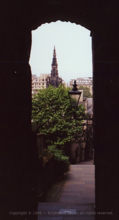 As I was walking up the hill towards the castle, I peered though this doorway (which appears but a black silhouette) and saw the spire below framed in a good photographic composition.